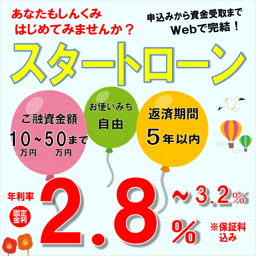 トップページ | 借りる | 小口フリーローン(スタートローン) ○Web仮審査型 Webお申込後、郵送またはご来店での正式な手続きが必要です。 ○Web完結型 お申込みからご契約まで全てネットでお手続き可能です。 スタートローン(Web仮審査型) お申込みはこちら スタートローン(Web完結型) お申込みはこちら 商品内容 金額 10万円以上50万円以内 使いみち 自由 期間 5年以内 融資利率 年2.8%~年3.2%(固定金利)※融資利率には保証料を含みますが、審査結果により年0.4%~年1.4%の保証料が上乗せされる場合がございます。 保証 ㈱ジャックス 商品概要説明書