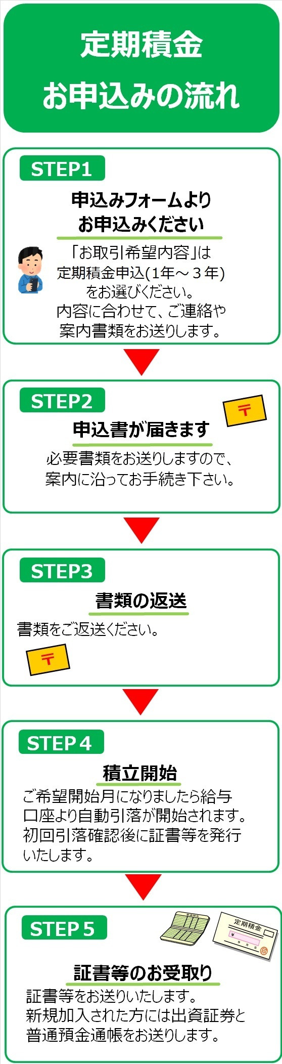 トップページ | 貯める | 定期積金 お申込み時に積立する金額と期間を決め、給与口座から自動引落で積立をする預金です。積立期間がエンドレスの「だんだんつみたて(積立定期預金)」とは異なり、満期があります。満期時にお申し出がない場合、同額・同期間で自動継続されますので、積立の停止を希望する場合は満期のご案内に従ってご連絡ください。 詳しくはこちらへ お申込みはこちら
